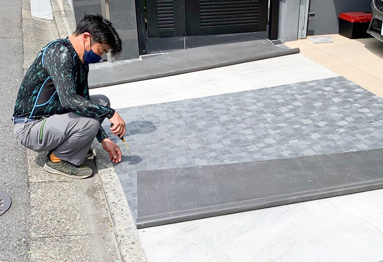 自社足場工事のアンカーを打つ経験からの試行錯誤の末に、駐車場にもPVCシートを貼る事が出来る様になりました。PVCシートとは、タキロンエンビ素材で出来ているシートでとても丈夫です。駐車場や外床等のクラックひびや汚れなども、綺麗に隠れますよ。
